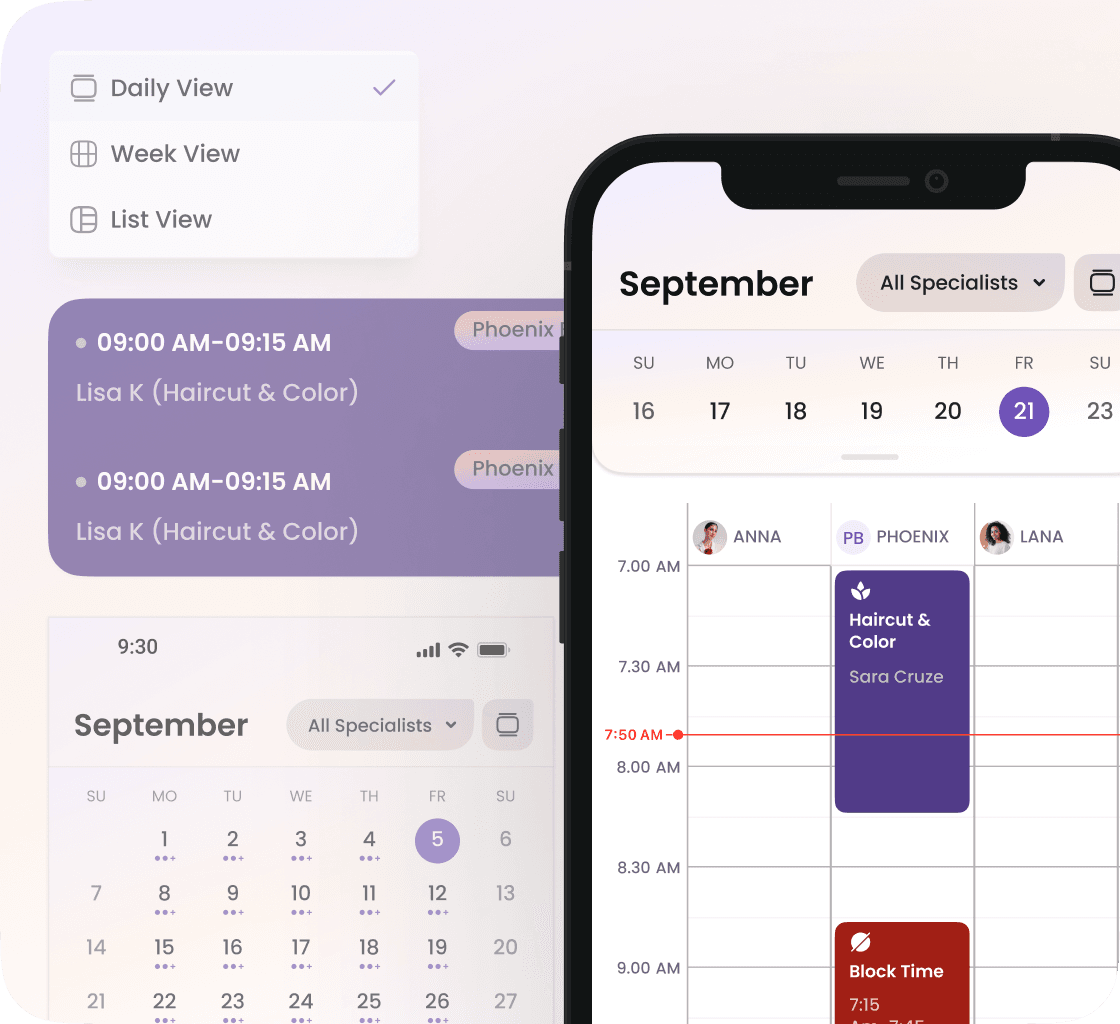 Simplify your scheduling with a calendar designed for busy businesses. Manage daily, weekly, and monthly appointments — per staff or per service — all in one seamless view.